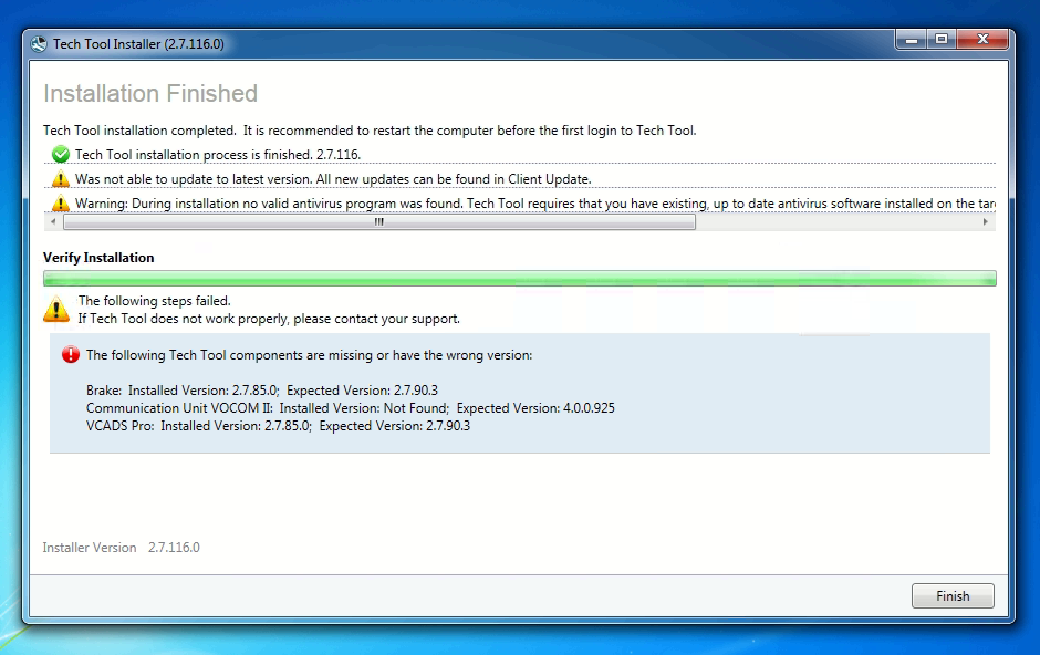 Вас беспокоит восклицательный знак ? Да по итоговому установщику не хватает компонентов Brake & Vcadspro , но это совершенно нормально, официальный аккаунт устанавливает точно также с нехваткой техже компонентов , можно расслабиться.