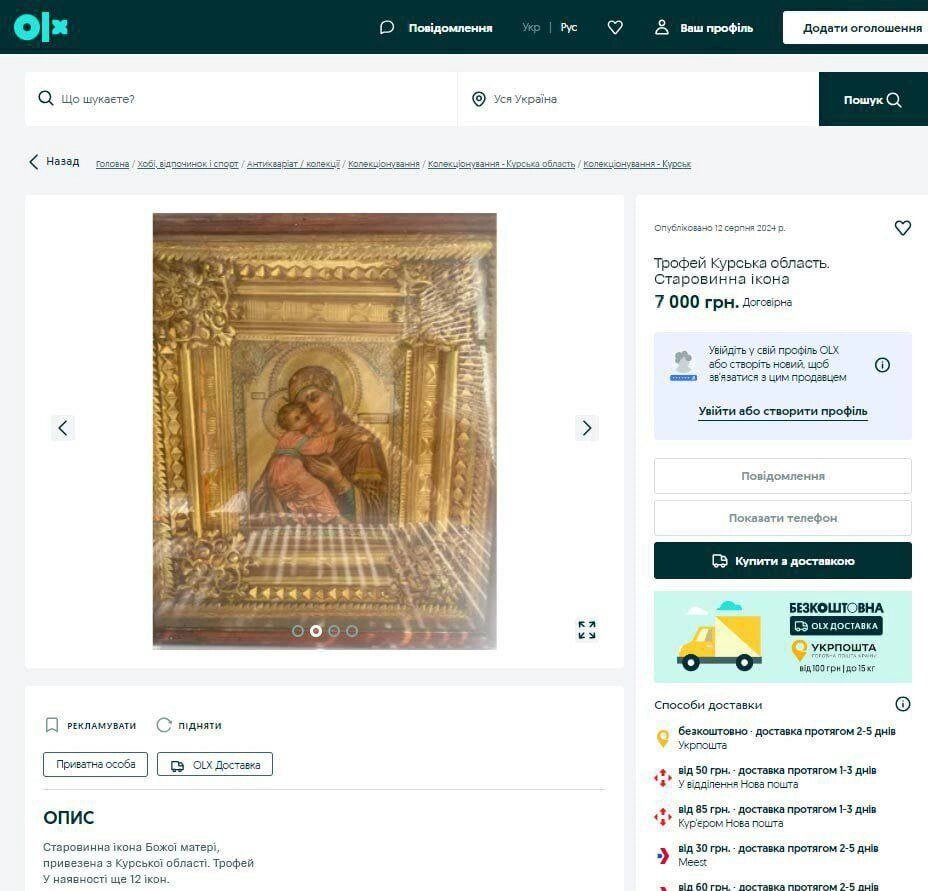 А єто ніхуя. Якби в тебе був аккаунт на ОЛХ, то ти б знав як виглядає саме твоє оголошення на ОЛХ. Отак як на твоїй картинці воно виглядає саме тоді, коли це твоє оголошення. А коли ти там щось шукаєш, щоб купити, то тоді на екрані є продавець, його місцезнаходження, телефон, його продажі, рейтинг і таке інше. Тобто тупий кацап, який хоче когось наїбать заради тупої пропаганди, створює аккаунт ліпить фото якоїсь ікони, пише пояснення про курську область і скрінить екран. Далі це все нікуди не йде, бо по-перше, спочатку оголошення проходить модерацію і модератор не пропустить цю хуйню в продаж і воно просто не з'явиться там, а в кращому випадку ти цю ікону побачиш у вкладці "відхилені" з поясненнями чому саме, а в гіршому ти будеш забанений назавжди за продаж краденого, тим більше, що ти сам про це розказав. Я не можу розмістити І-прог на ОЛХ, він в мене у вкладці "відхилені" з поясненнями, що цей товар порушує авторські права. Прикинь. Лєксія пройшла, за Кан Кліп треба чомусь платити за розміщення, а І-прог сука китайський порушує права якогось чорта який спиздив програму у хуй знає в кого, зробив свою версію в Україні і продає. А я на ОЛХ порушую його срані права.