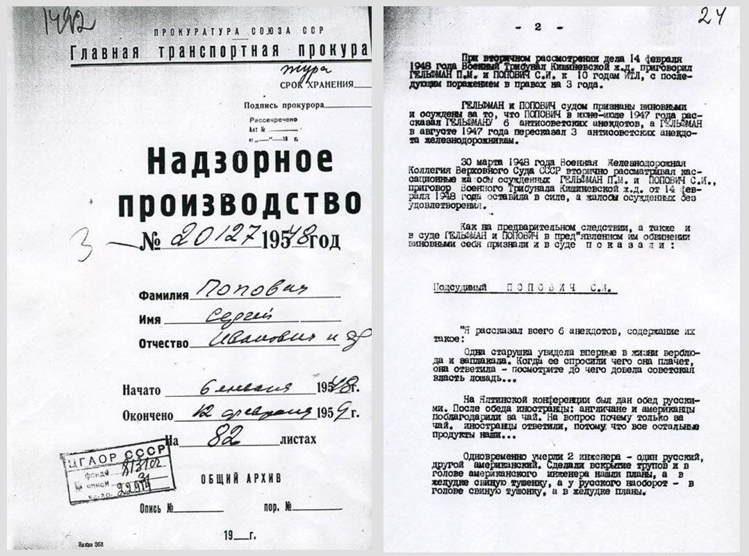 "Одна старушка увидела впервые в жизни верблюда и заплакала. Когда её спросили чего она плачет, она ответила - посмотрите до чего довела советская власть лошадь...". Приговор: "10 лет лишения свободы". Эх, какую страну потеряли! |
